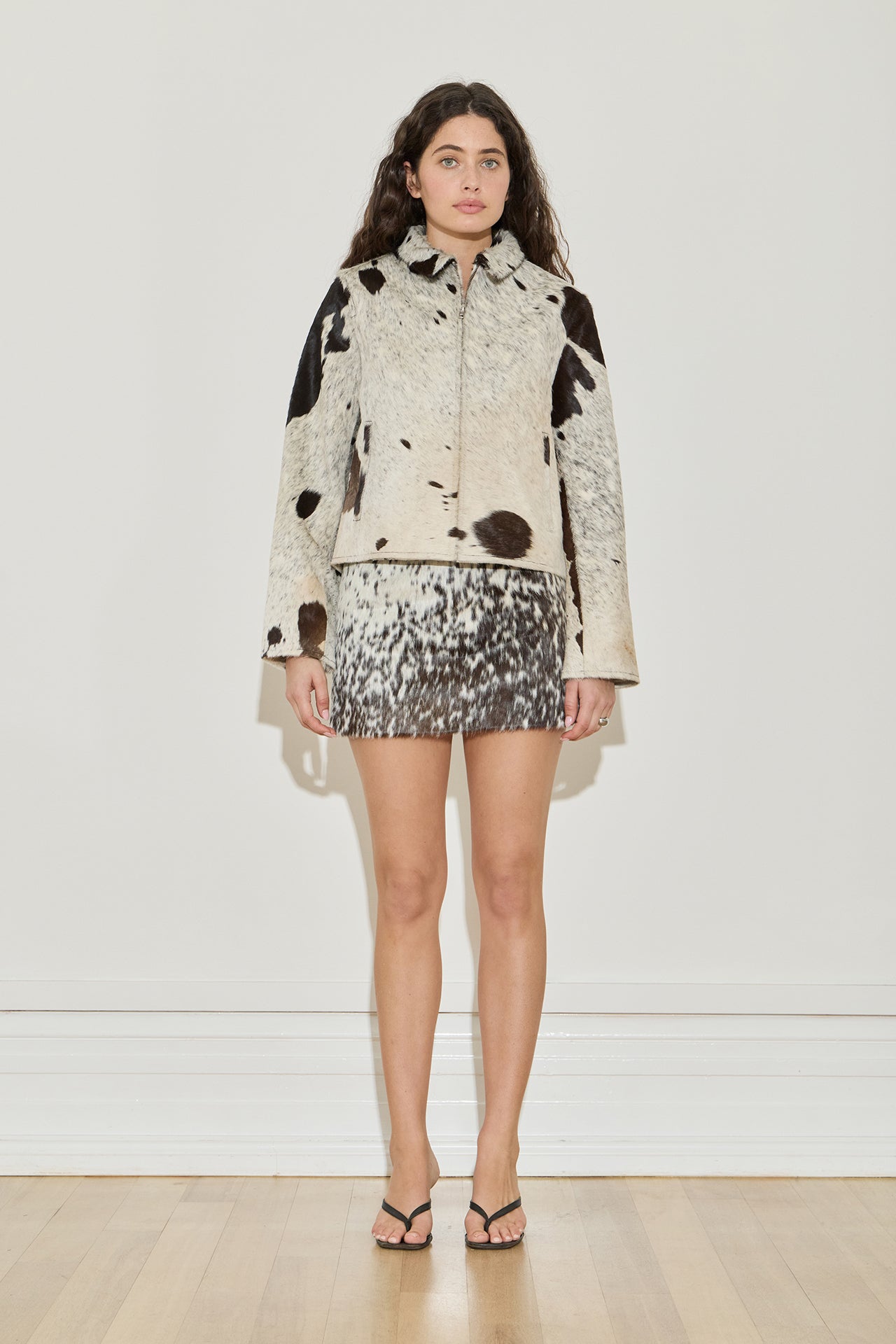 The Cowhide Mini Leather Skirt in Brown & White Hide is a refined staple with a clean, structured silhouette. Crafted to sit mid-waist, it’s fully lined and features discreet back welt pockets, subtle darting, and side zip for a seamless finish.
