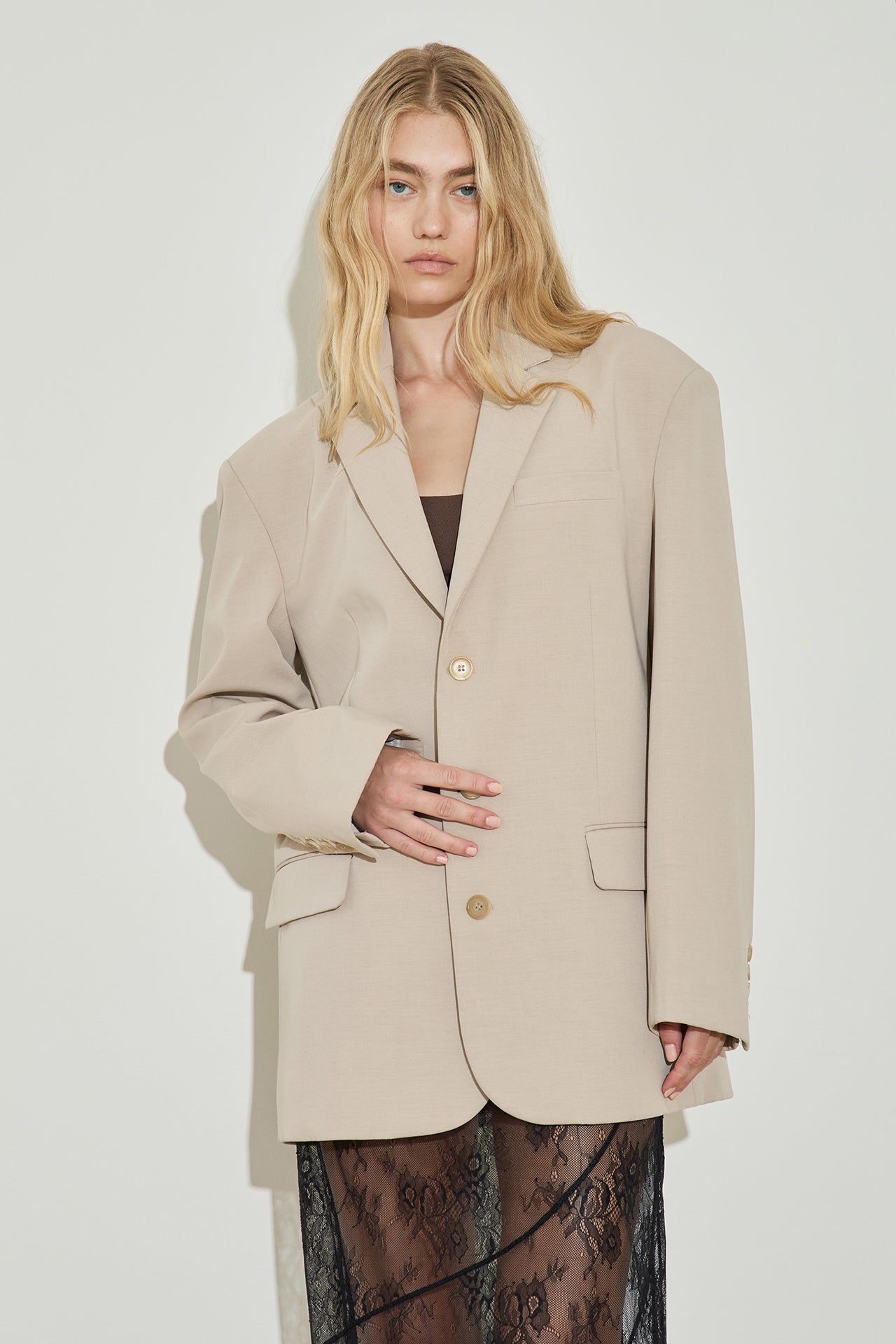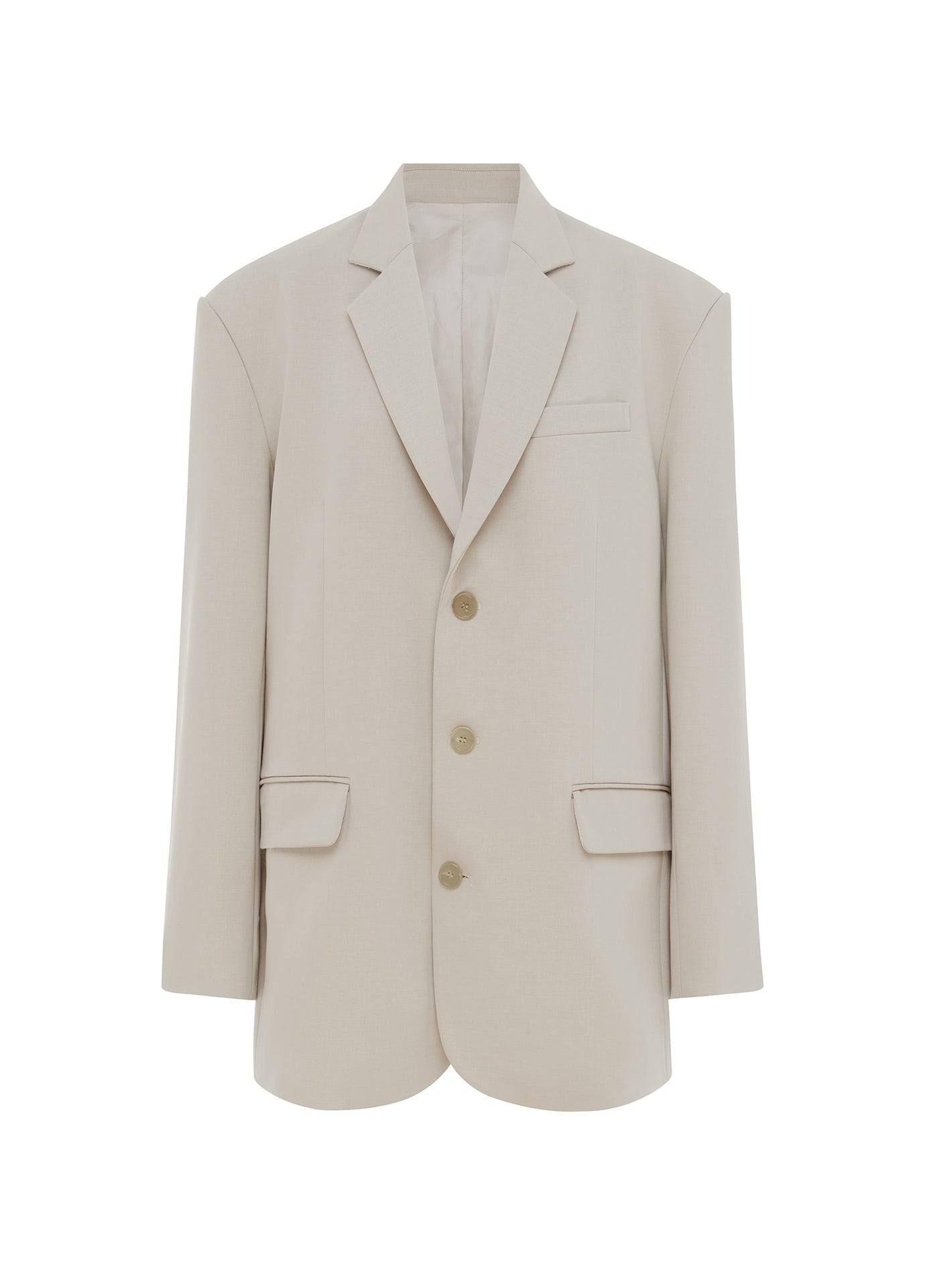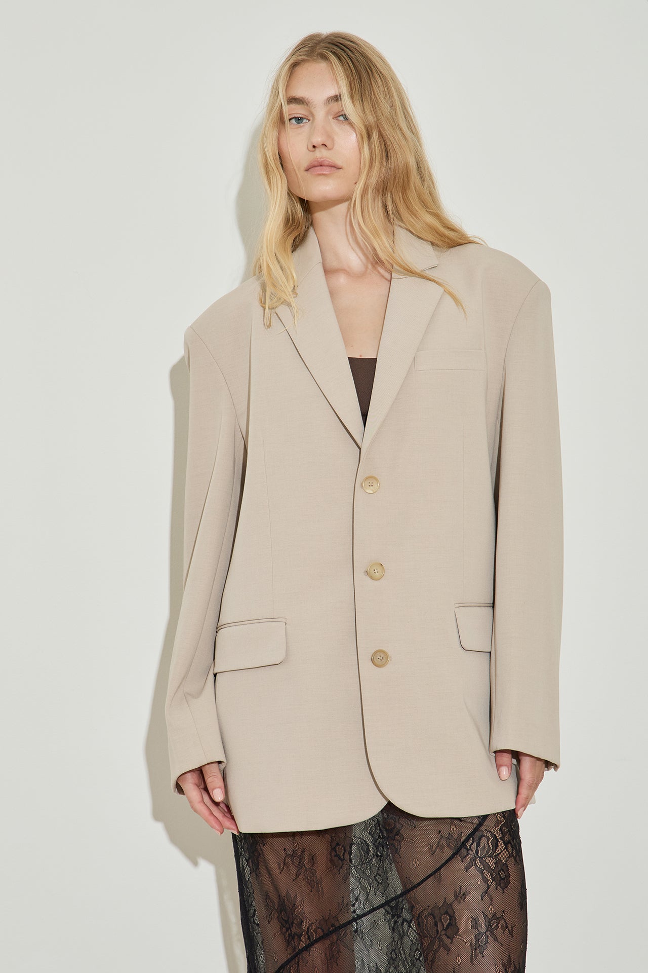 Our new oversized blazer: made from a mid weight traditional suiting fabric in an oversized silhouette, featuring padded shoulders and three button front closure. Fully lined.