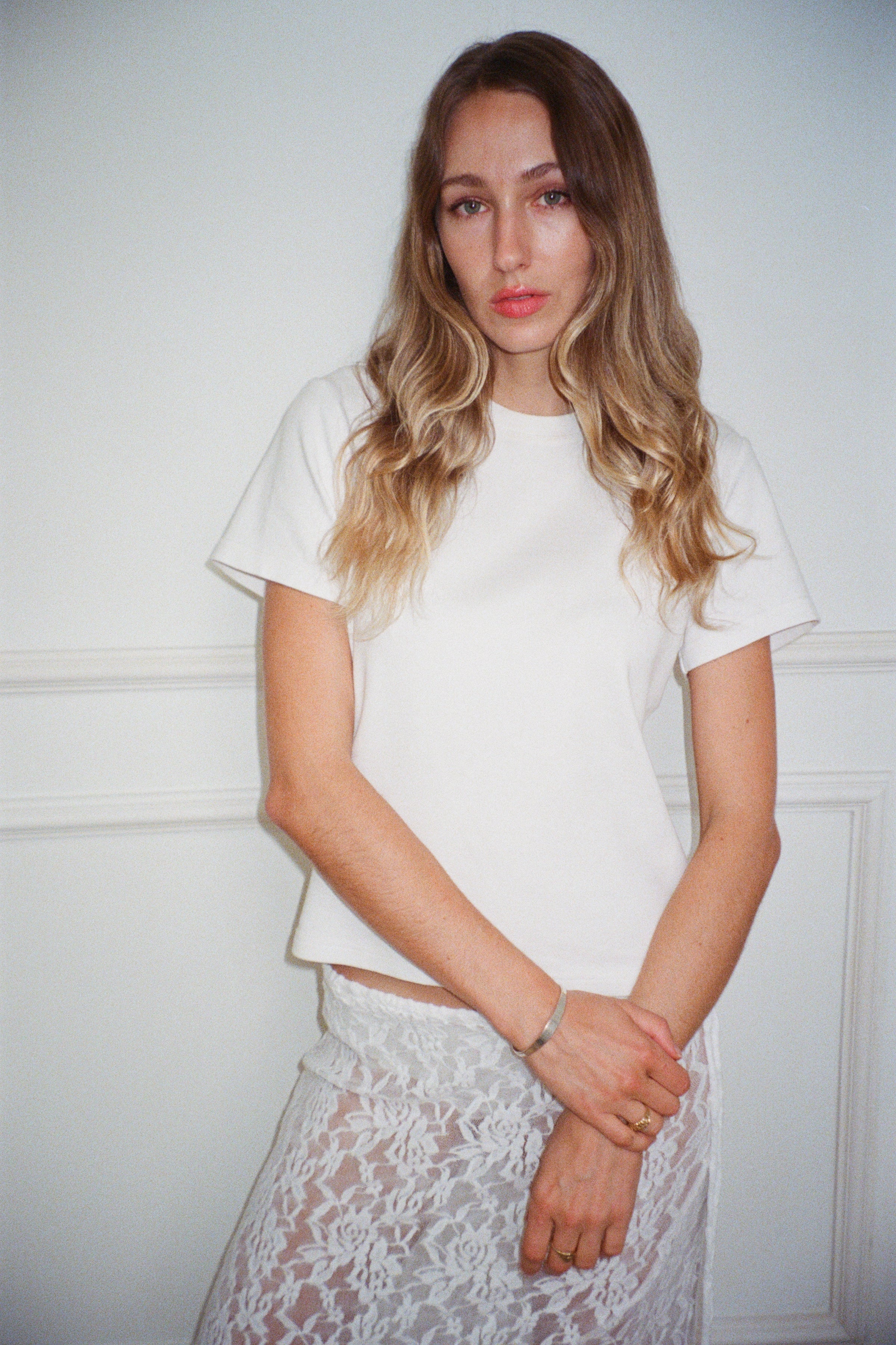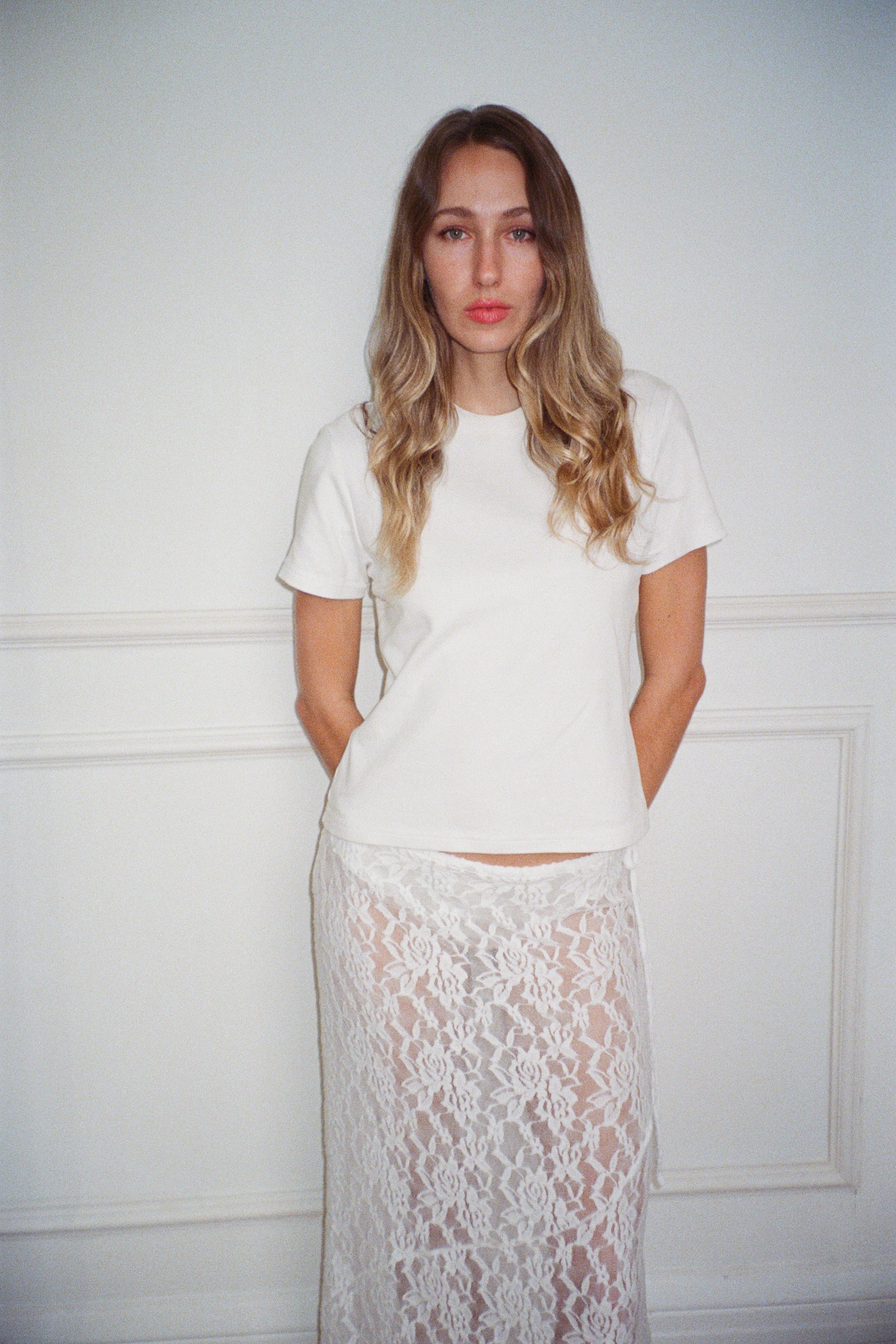Our best selling Lace Skirt, now crafted in a new heavier weight lace. Designed to be worn mid rise. Seams panel the skirt creating thoughtful details. Pair back with our Oversized Tie Up Shirt or elevate the look with our Boyfriend Blazer.