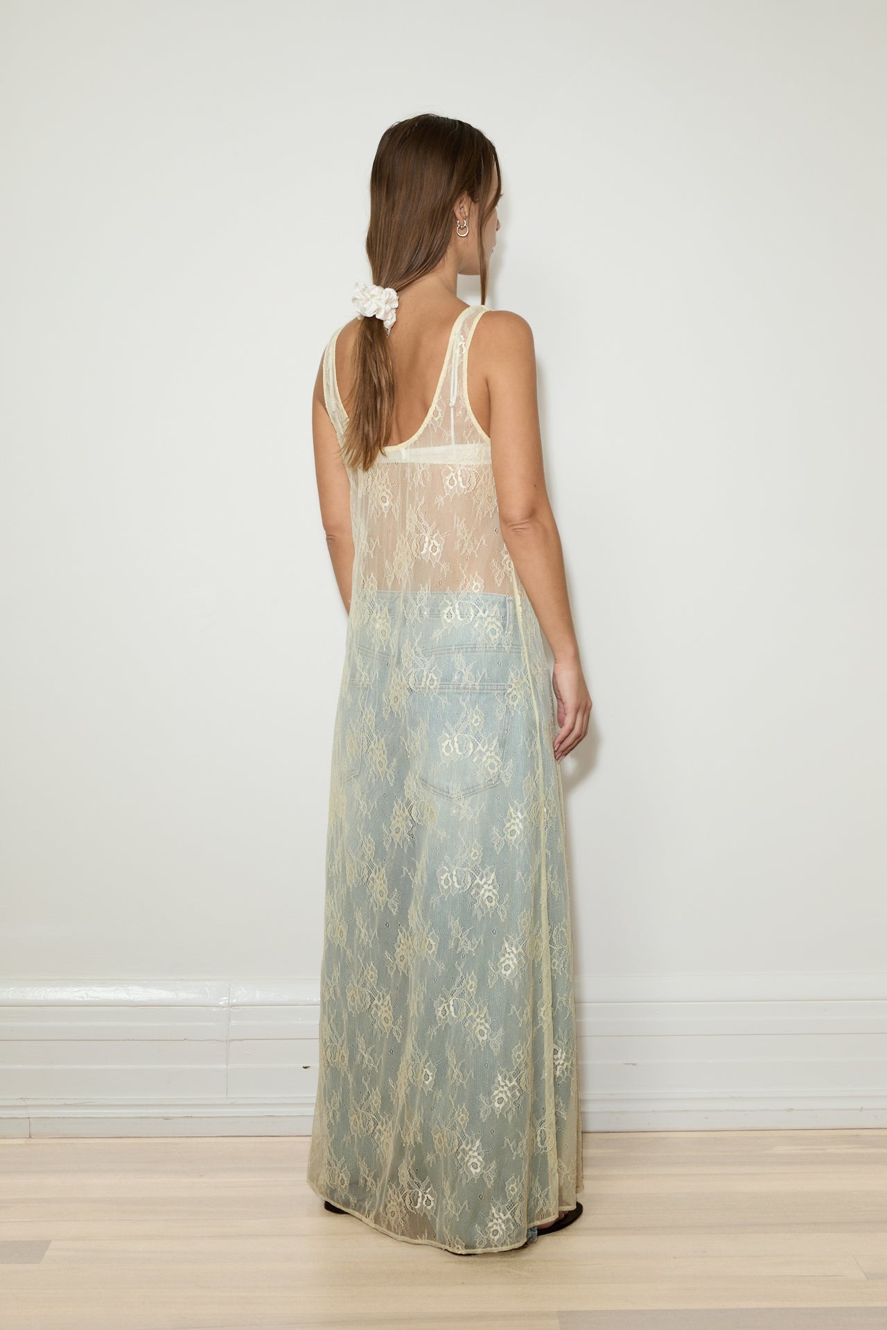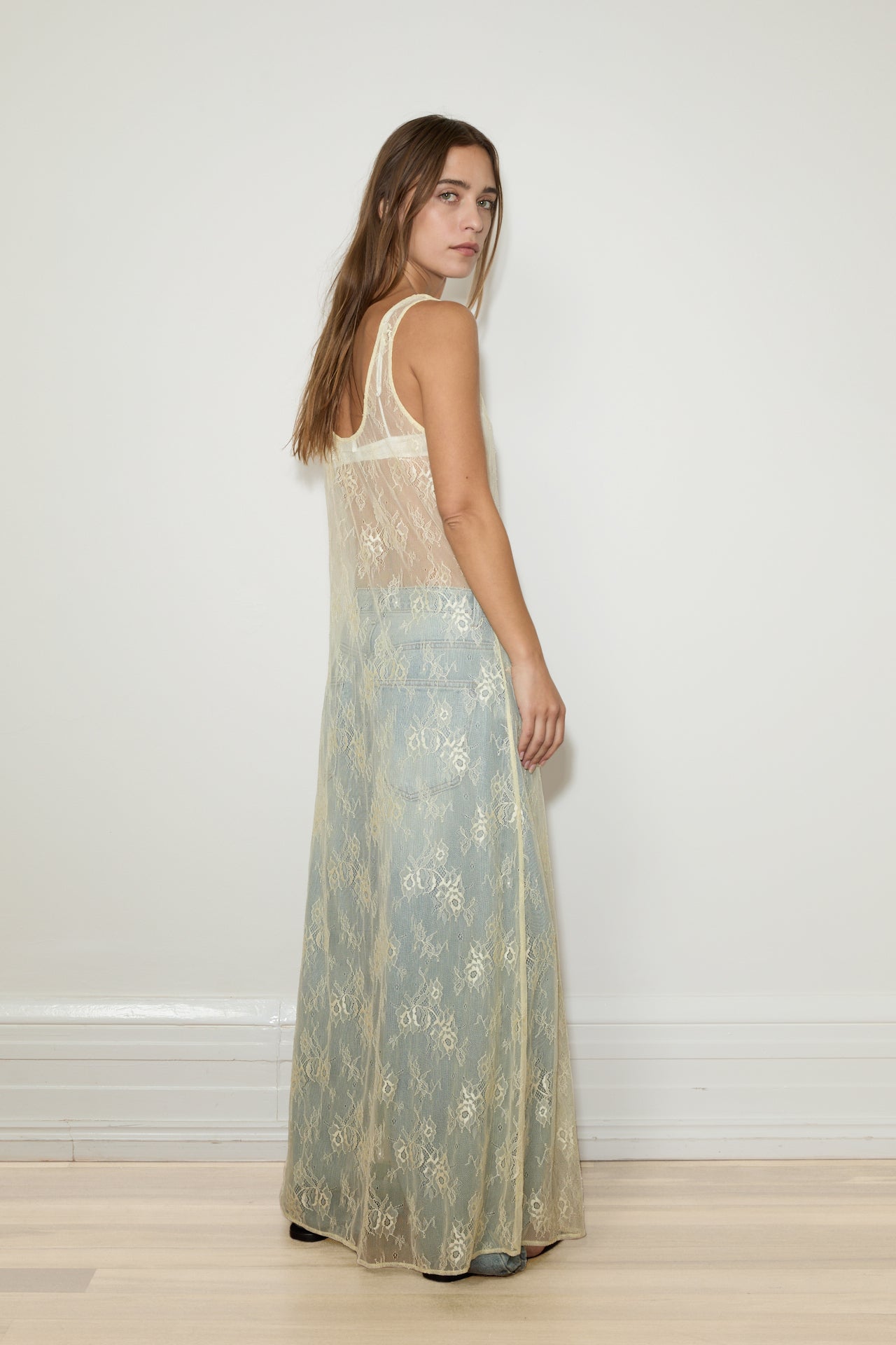 With thick straps and a scoop neckline, the Scoop Neck Maxi skims the body before falling at the ankle. Its versatility allows you to wear it with a sandal during the day or dressed up with heels for date night. Crafted from our premium sheer lace, the Scoop Neck Maxi offers as a layering piece that can be styled over swim, with a high waist brief or the MAISON ESSENTIELE Low Rise Boyfriend jean in our indigo colour way for a unique layered ensemble that transitions seamlessly from casual daytime outings to sophisticated evening events.