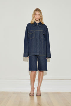 A modern take on a classic staple, the Denim Jort is cut from structured, deep indigo denim with a mid-rise fit and straight leg silhouette. Designed for everyday ease with a tailored edge and our signature MAISON ESSENTIELE embroidery on the back yoke.