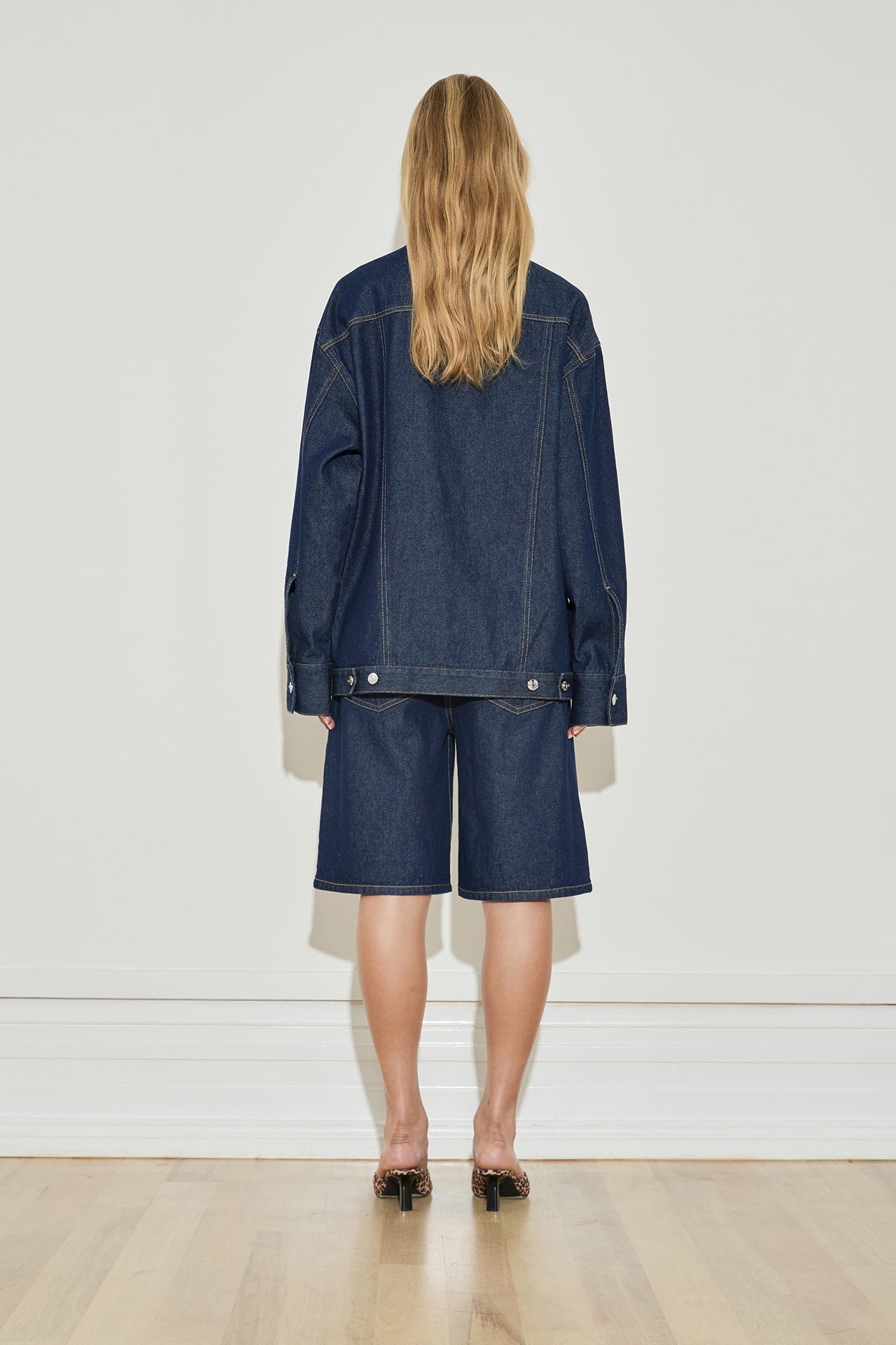 A modern take on a classic staple, the Denim Jort is cut from structured, deep indigo denim with a mid-rise fit and straight leg silhouette. Designed for everyday ease with a tailored edge and our signature MAISON ESSENTIELE embroidery on the back yoke.