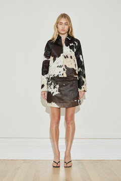 The Cowhide Mini Leather Skirt in Brown & White Hide is a refined staple with a clean, structured silhouette. Crafted to sit mid-waist, it’s fully lined and features discreet back welt pockets, subtle darting, and side zip for a seamless finish.