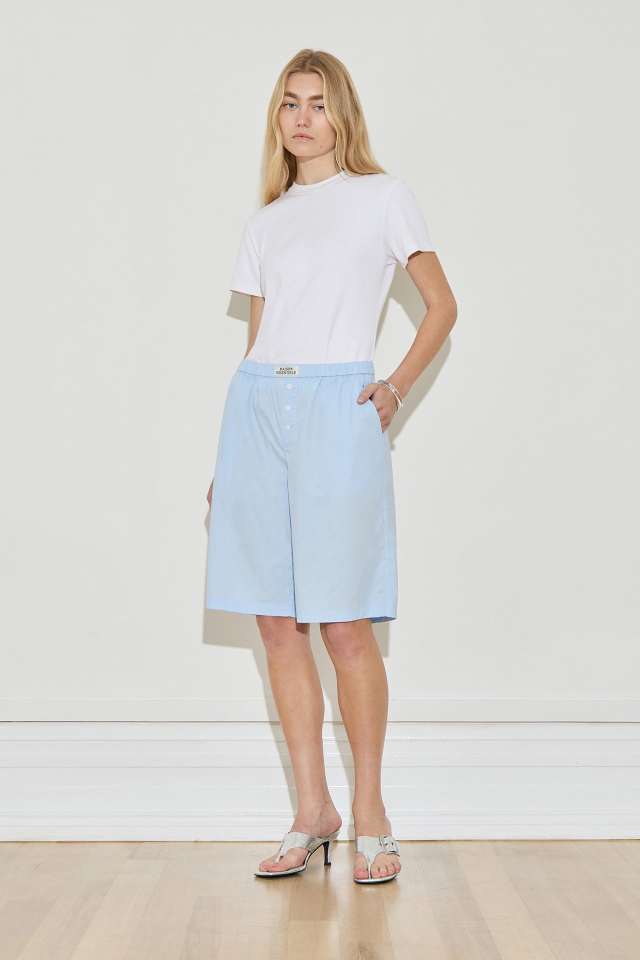 The Longline Cotton Short in Powder Blue is designed for effortless, everyday wear. Cut in 100% cotton, this relaxed silhouette features a longer line leg for a flattering fit, perfect for warm-weather styling.
